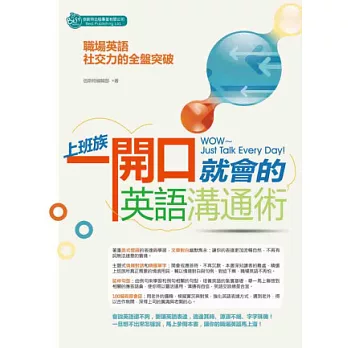 <<上班族一開口就會的英語溝通術>>是一本實用又符合職場需求的萬用英語學習書。由於瞭解到,在上班時,需要用英語對話的場面,有時著實讓人心生恐懼,就怕應對的不好或不恰當,讓人不由自主地緊張起來。因應許多上班族和公司行號的需要,本書收納了各式各樣上班族會面對的英語溝通場景,有好的預備,就不怕應用的時候會沒辦法。解決上班時英語溝通的困擾,就是要在許多常用與會用到的工作情境英語的對談的內容上學習如何用英語來表達,本書就是最好的輔助,讓你對於很多常常使用卻又不知道如何用英語說才好的會話、句型與詞彙,有一個全盤吸收的主題式學習,經由令人感到興趣的辦公室話題與討論,增進讀者的對於學英語的興趣並加深印象,讓學習的動機與成果更加有效與提升。特別是本書讀起來讓人有輕鬆愉快之感,隨著有趣的情境對話,一步步強化職場英語的能力。鼓勵您好好善用本書,您會有意想不到的收穫的。